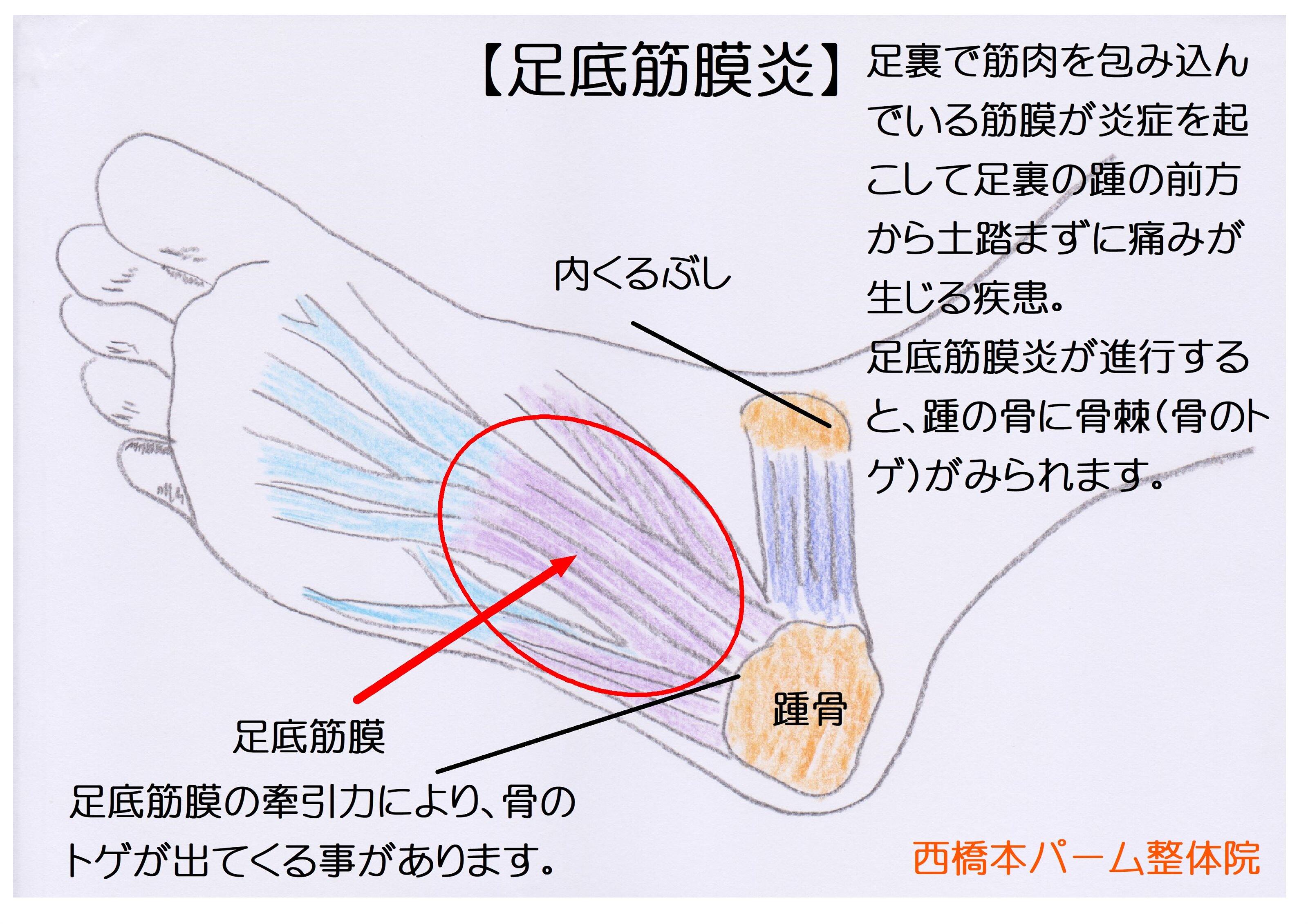 足裏で筋肉を包み込んでいる筋膜が炎症を起こして足裏の踵の前方から土踏まずに痛みが生じる疾患。