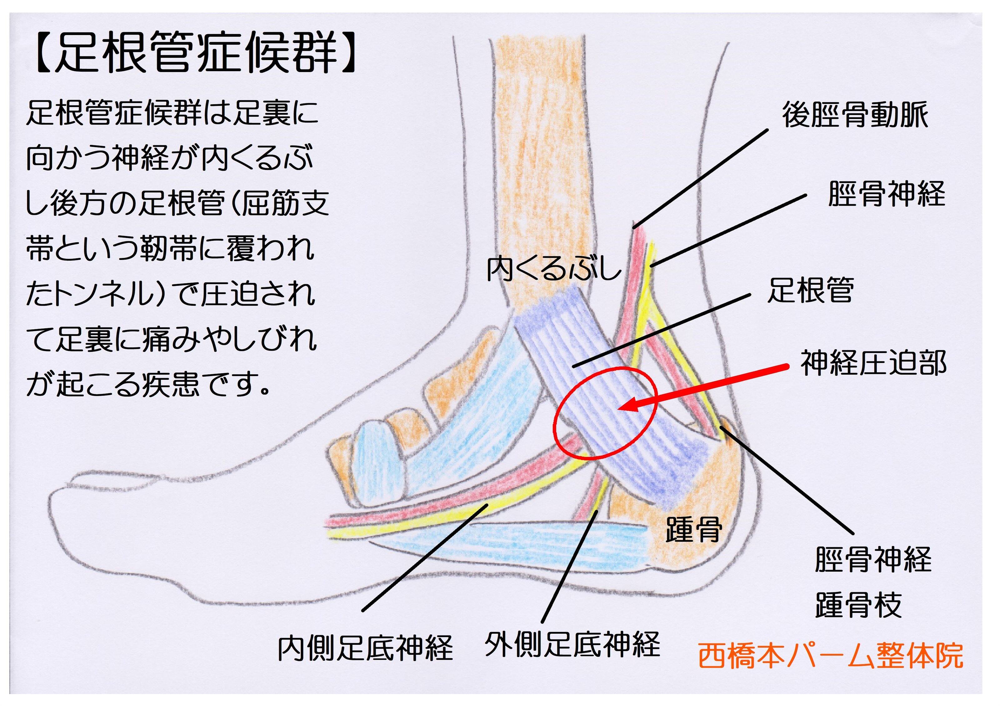 足根管症候群は足裏に向かう神経が内くるぶし後方の足根管(屈筋支帯という靭帯に覆われたトンネル)で圧迫されて足裏に痛みやしびれが起こる疾患です。