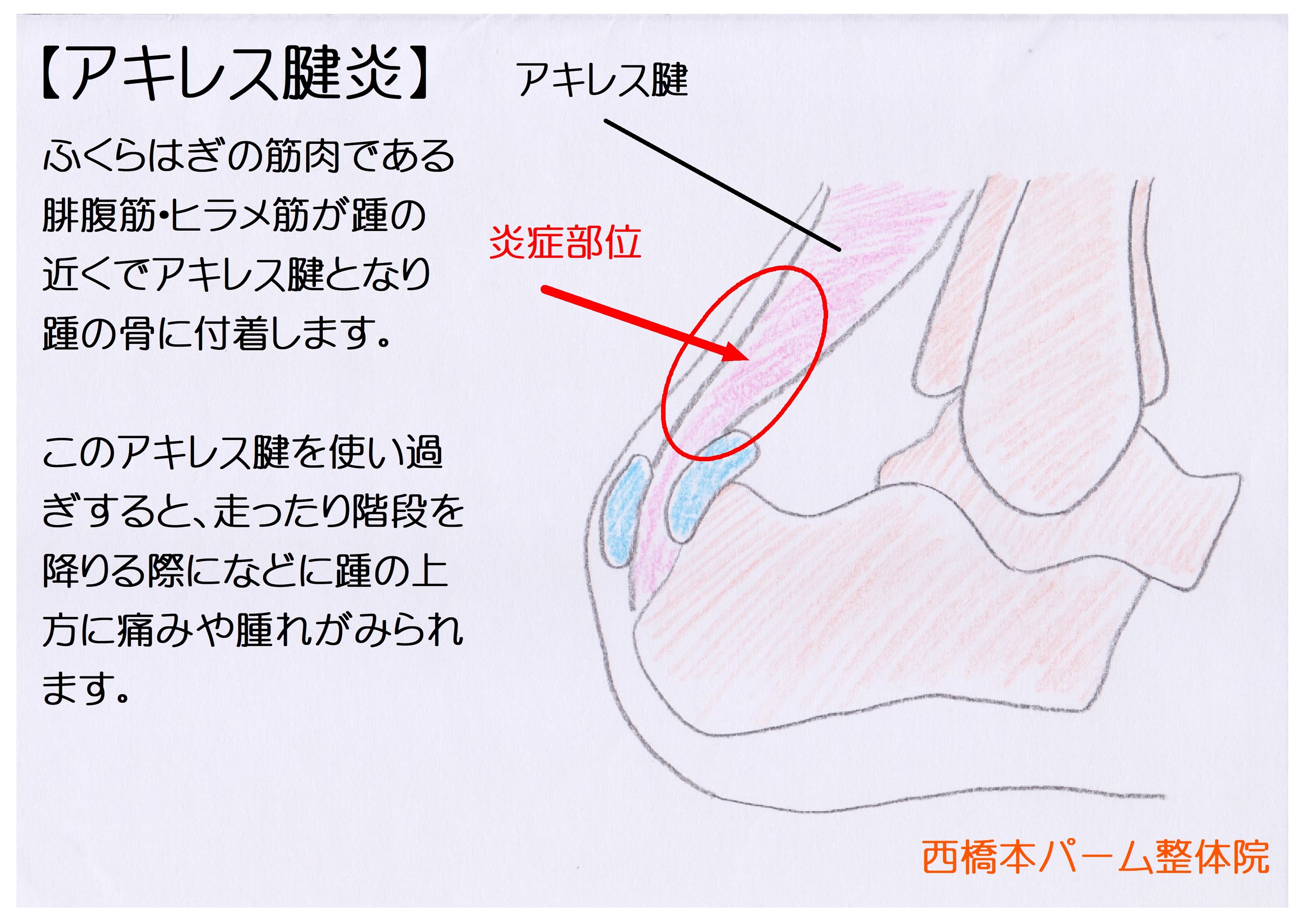 このアキレス腱を使い過ぎすると、走ったり階段を降りる際になどに踵の上方に痛みや腫れがみられます。