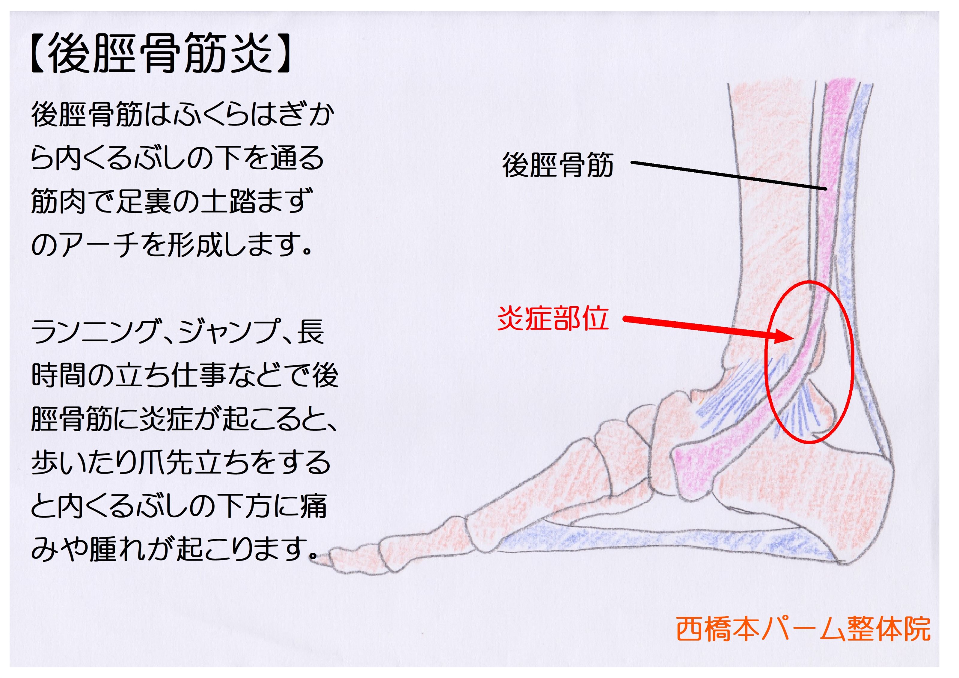 ランニング、ジャンプ、長時間の立ち仕事などで後脛骨筋に炎症が起こると、歩いたり爪先立ちをすると内くるぶしの下方に痛みや腫れが起こります。