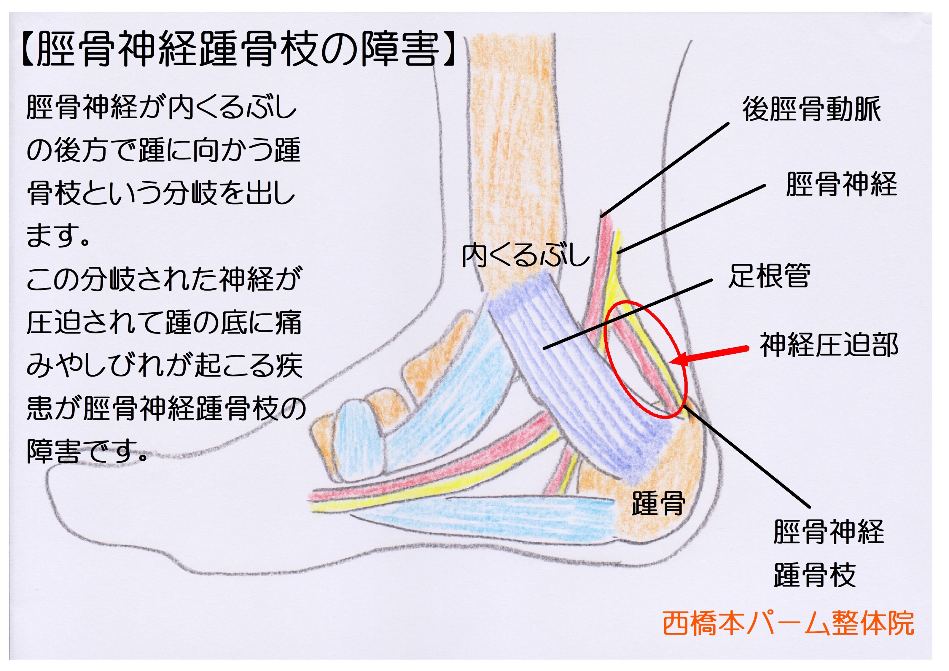 内くるぶし後方の筋膜と神経が癒着を起こし、神経の滑りが悪くなる事で起こります。