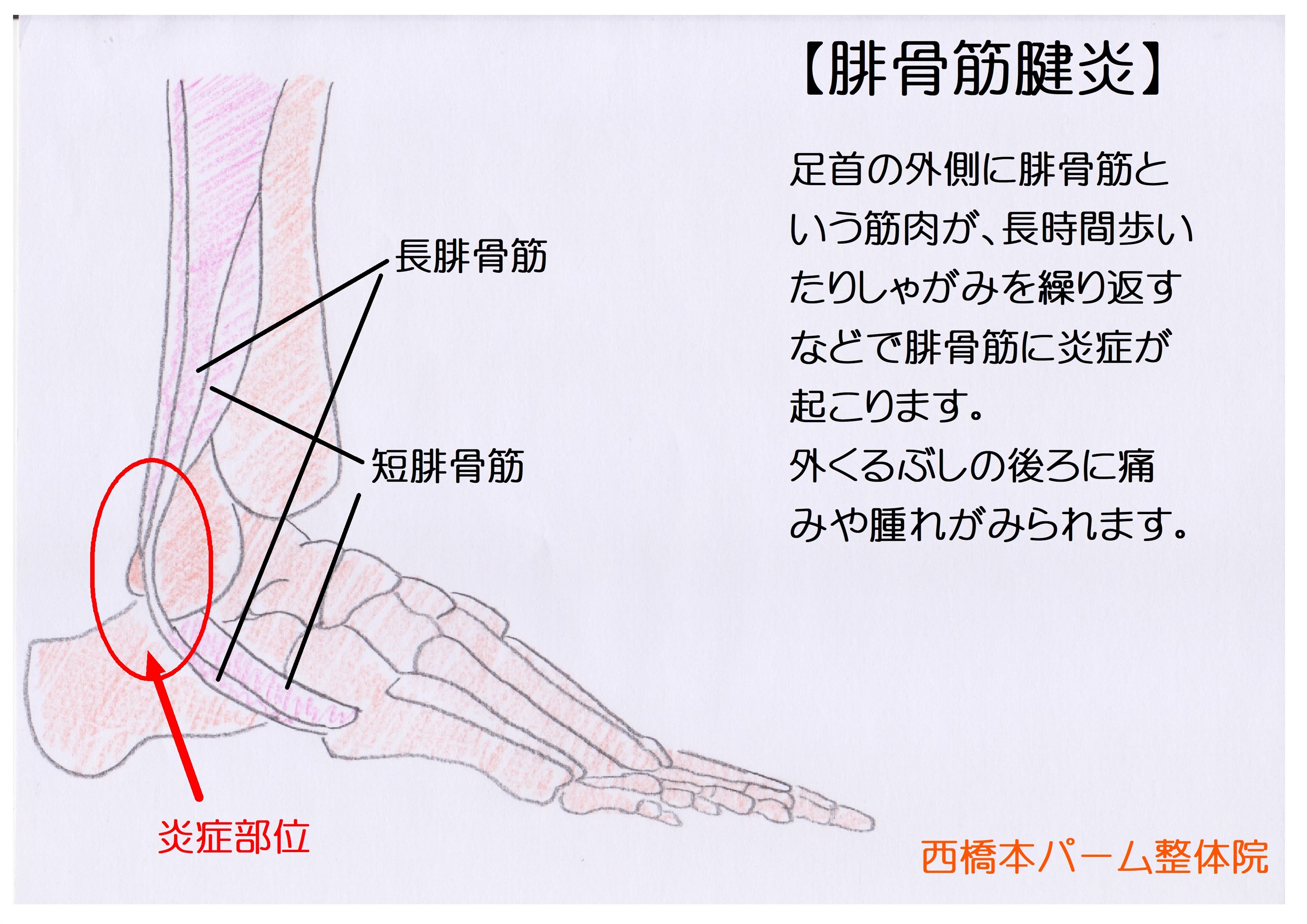 足首の外側に腓骨筋という筋肉が走行しており、長時間歩いたりしゃがみを繰り返すなどで腓骨筋に炎症が起こります。
