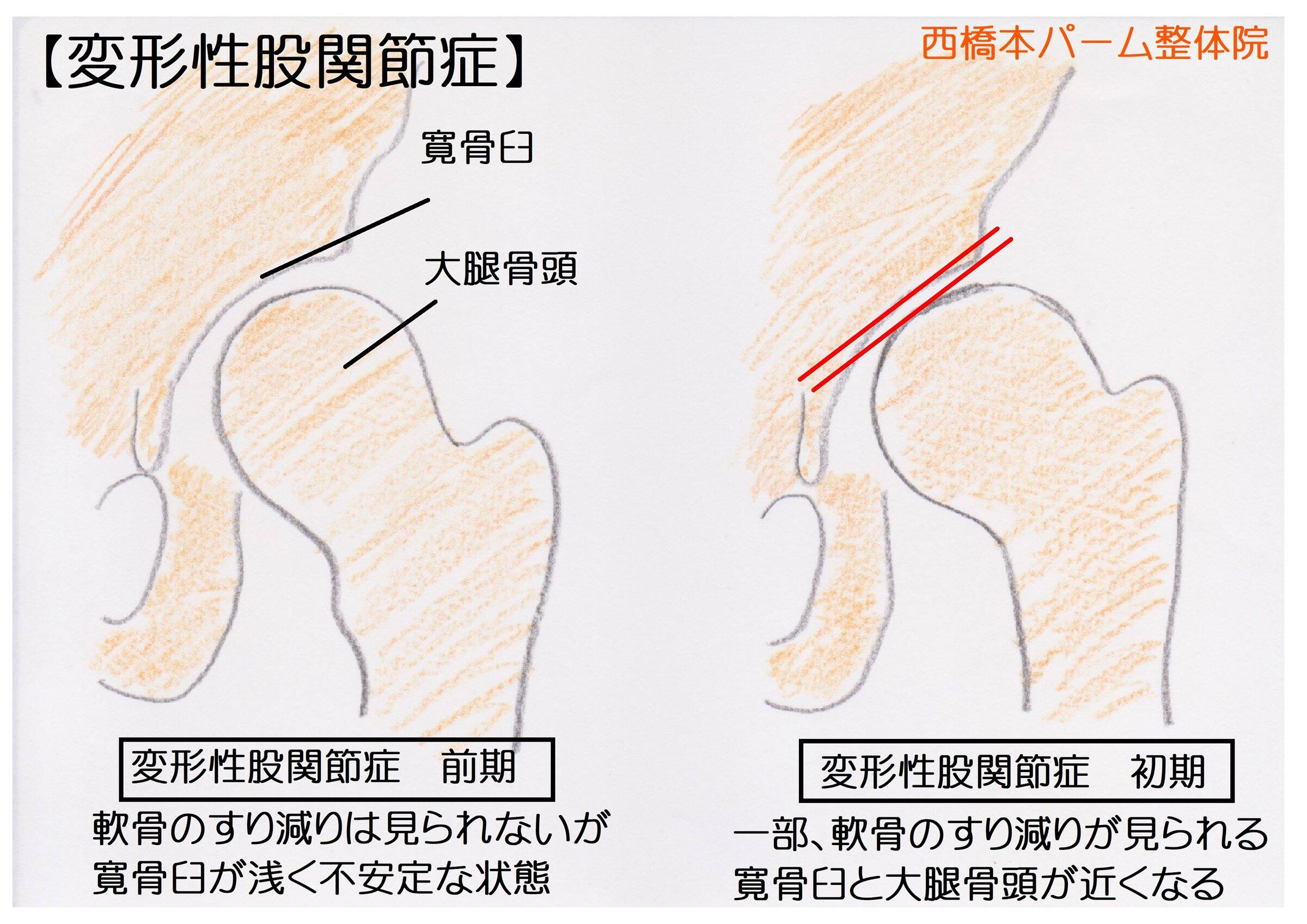 臼蓋形成不全・臼蓋発育障害などの病気が素因としてあり、太ももの骨頭を覆っている骨盤側の臼蓋(受け皿)が浅く、骨頭を覆う部分が少ないため不安定な状態で生活を送っている事で段々と軟骨がすり減ることが多い。