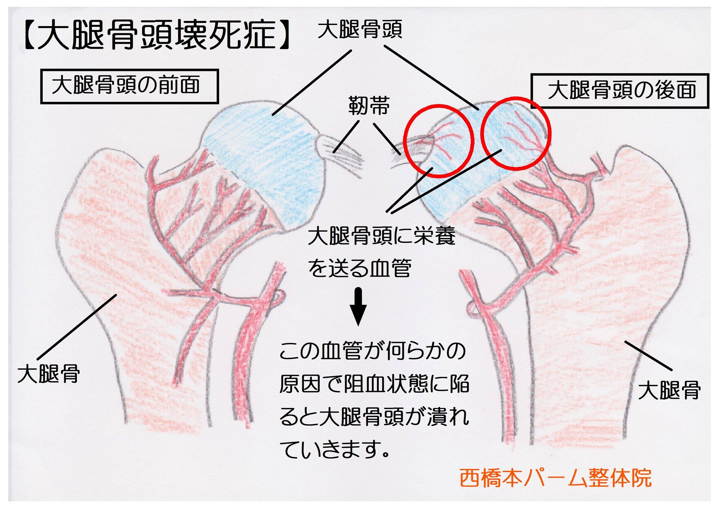 股関節の太もも側の骨の一部が血行不良により潰れてしまう病気が大腿骨頭壊死症であります。
