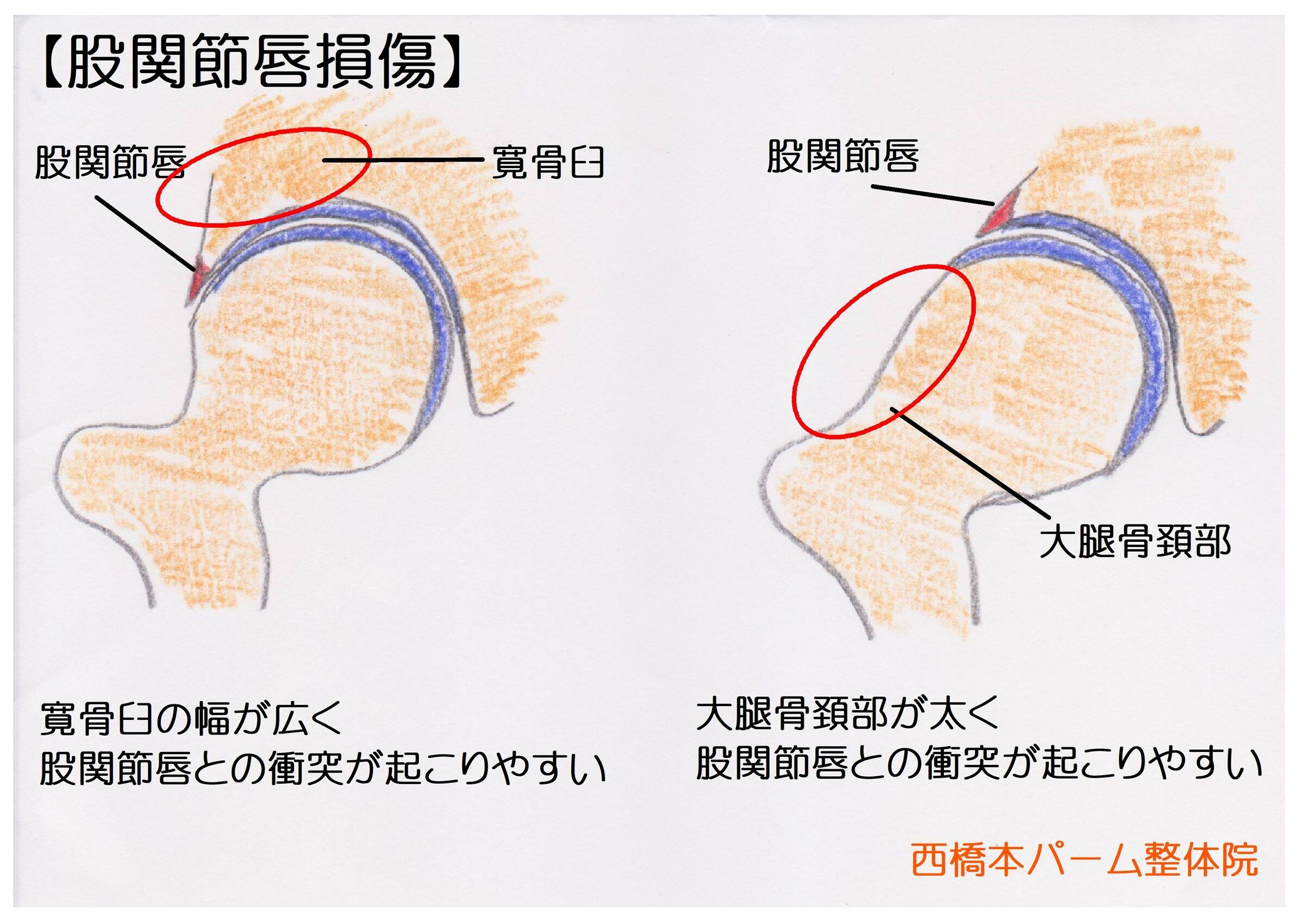 股関節は大腿骨頭と骨盤の寛骨臼で形成された関節で、大腿骨の頚部と寛骨臼に形態的な異常があると股関節唇損傷が起こります。