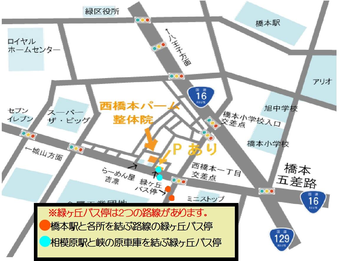 当院から40m程の近くにある緑ヶ丘バス停は相模原駅と峡の原(はけのはら)車庫を結ぶ路線で橋本駅に発着がありません。